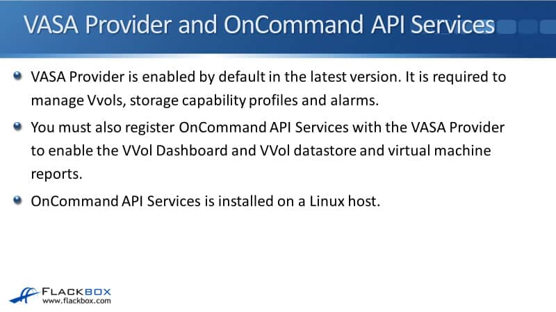 VASA Provider and OnCommand API services. The VASA Provider is enabled by default in the latest version. Didn't use to be in previous versions. It's required to manage VVols, storage capability profiles, and alarms.