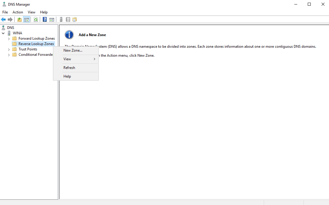 Expand the menu in the left-hand window, then right-click on Reverse Lookup Zones and select New Zone…