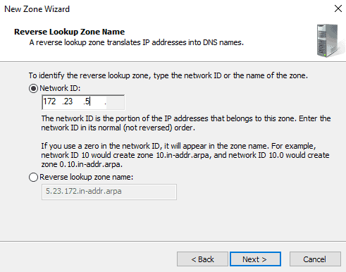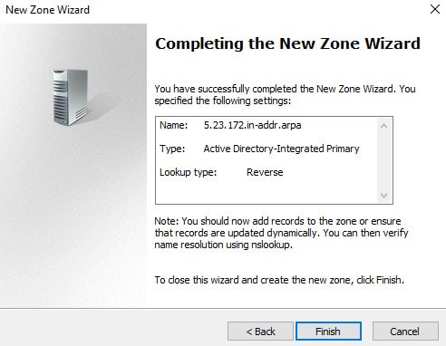 2. Create a DNS reverse lookup zone on the WinA server for the 172.23.5.0/24 network