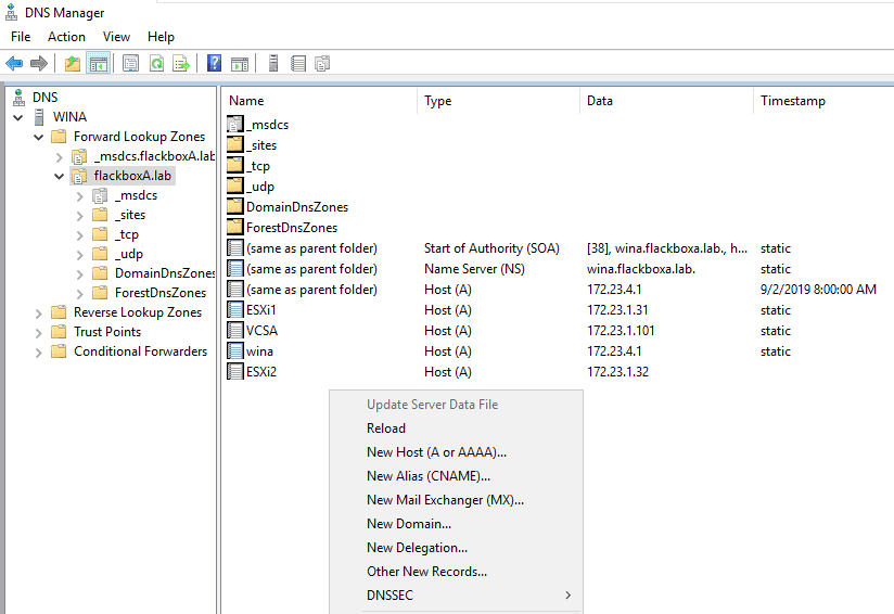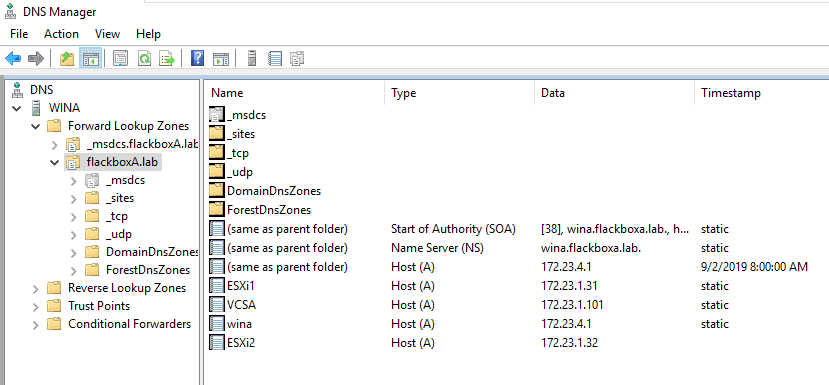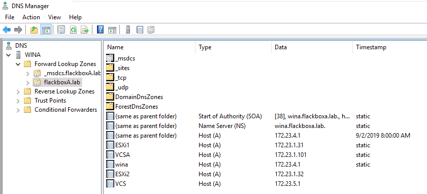 Expand Forward Lookup Zones in the left-hand window and select the flackboxA.lab domain.