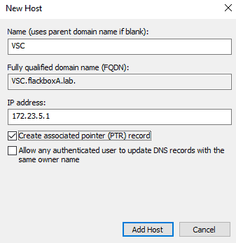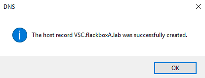 3. Configure an address record in DNS on the WinA server for vcs.flackboxa.lab with IP address 172.23.5.1