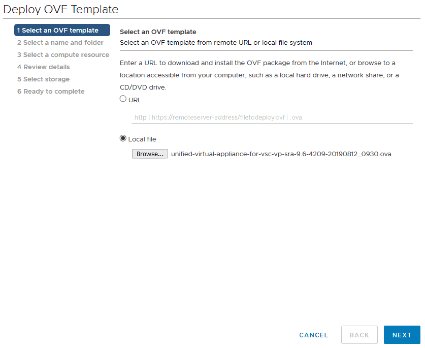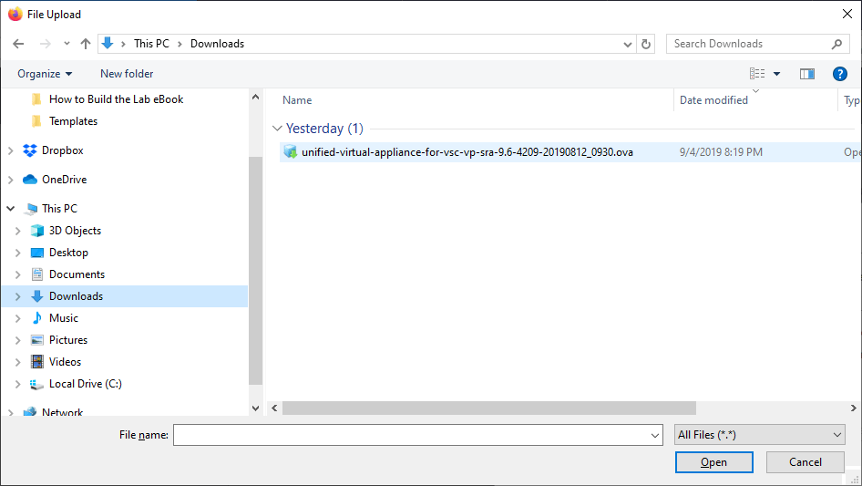 Browse to your Downloads folder, select the Unified Virtual Appliance for VSC OVA file you downloaded and click Open.