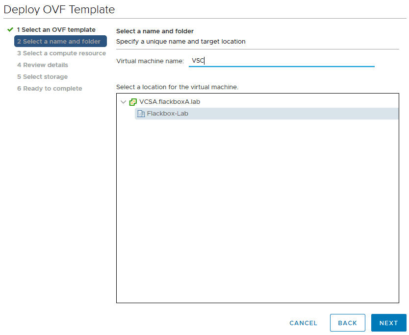 Name the virtual machine VSC and select Flackbox-Lab as the target location. Click Next