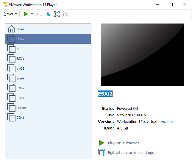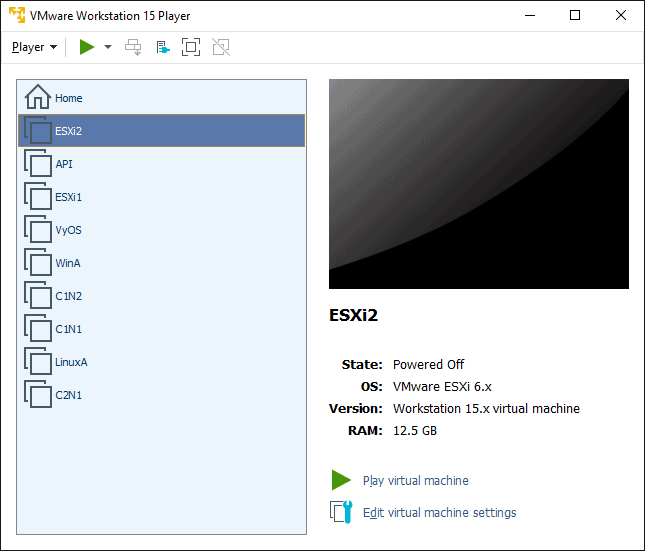 1. Suspend the C2N1 virtual machine in VMware Workstation Player. Power on the ESXi2 virtual machine. You should have only the VyOS, ESXi1, ESXi2 and WinA virtual machines running.