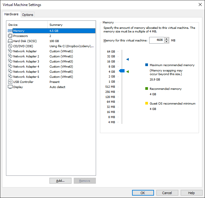 7. In VMware Workstation Player, set the Memory for the ESXi2 virtual machine as 4.5 GB. Power the ESXi2 virtual machine back on when completed.