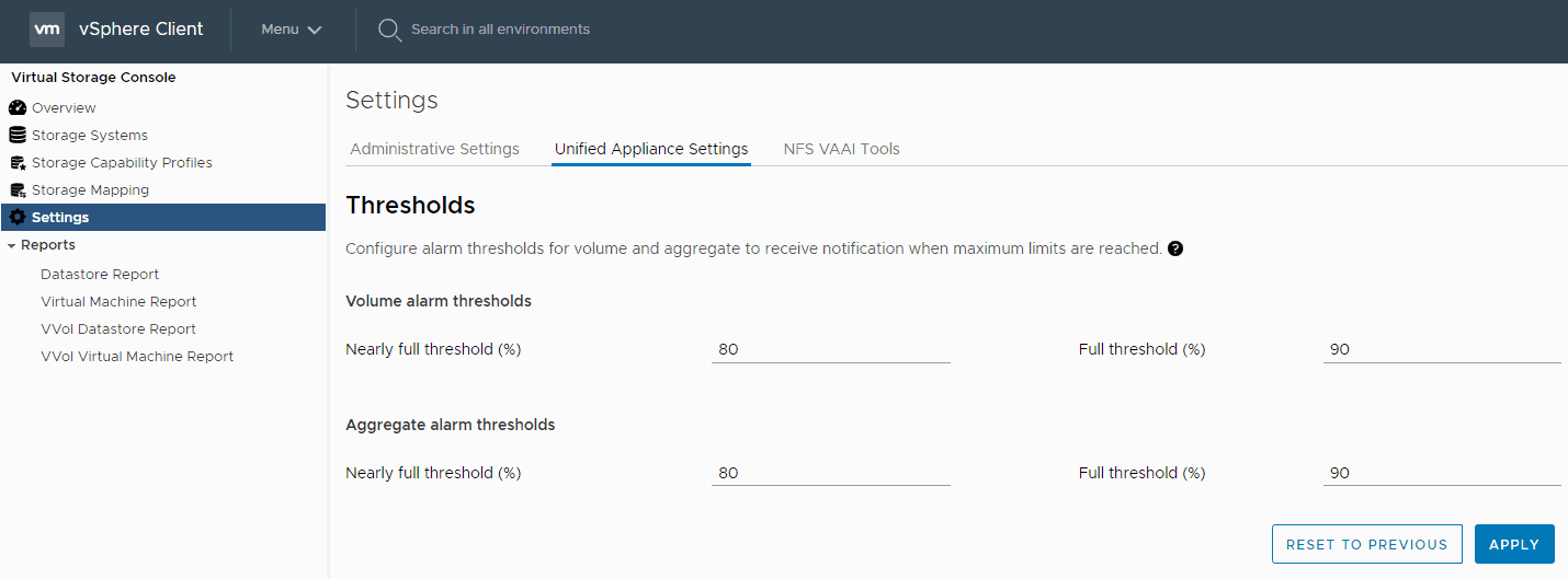 The ‘nearly full threshold’ is 80%, and the ‘full threshold’ is 90%, for both volumes and aggregates.