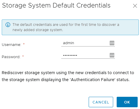 Valid login credentials for Cluster2 must be configured first. Click Settings > Administrative Settings > Configure Default Credentials for Storage System