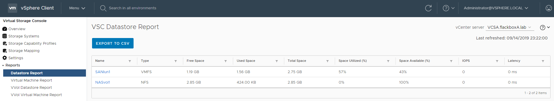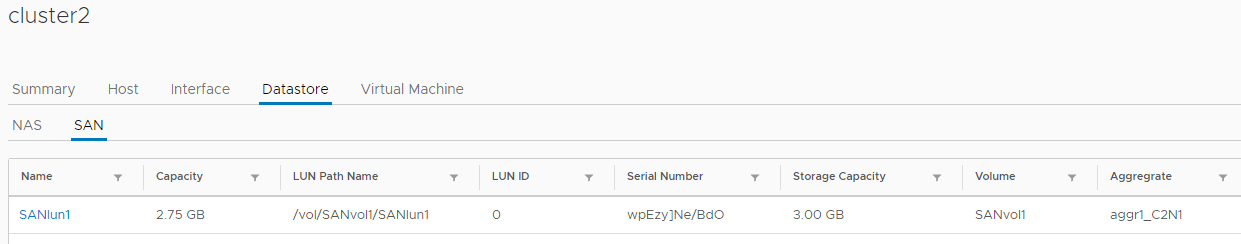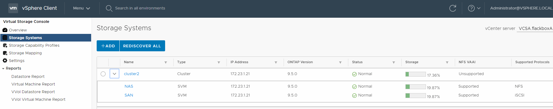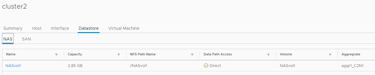 17. Verify that VSC has visibility of the NASvol1 and SANlun1 datastores.