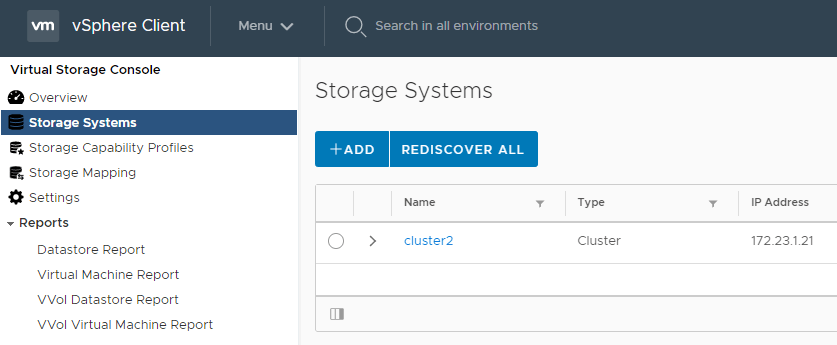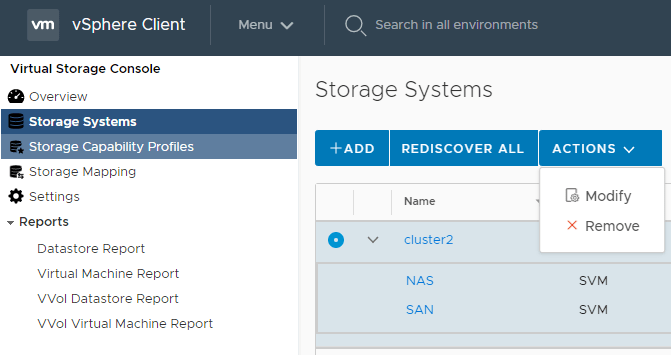 15. Verify the Cluster2 storage system has been added and the NAS and SAN SVMs are visible.