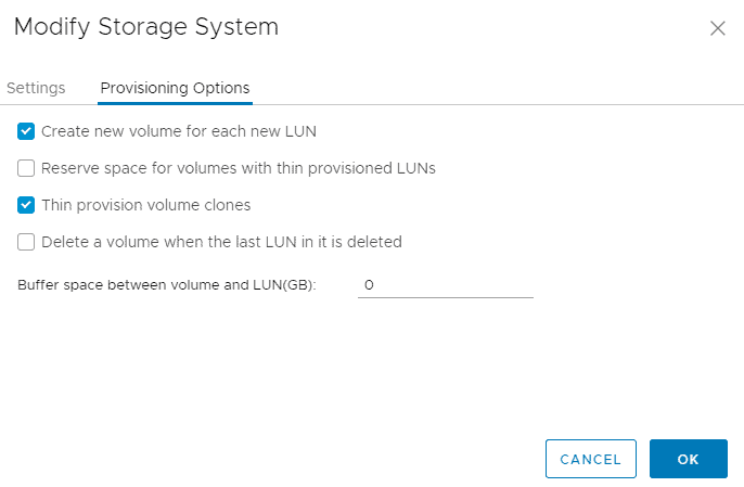 Click the checkbox to Create new volume for each new LUN, and set the Buffer space between volume and LUN (GB) to 0 to save space in the lab environment then click OK.
