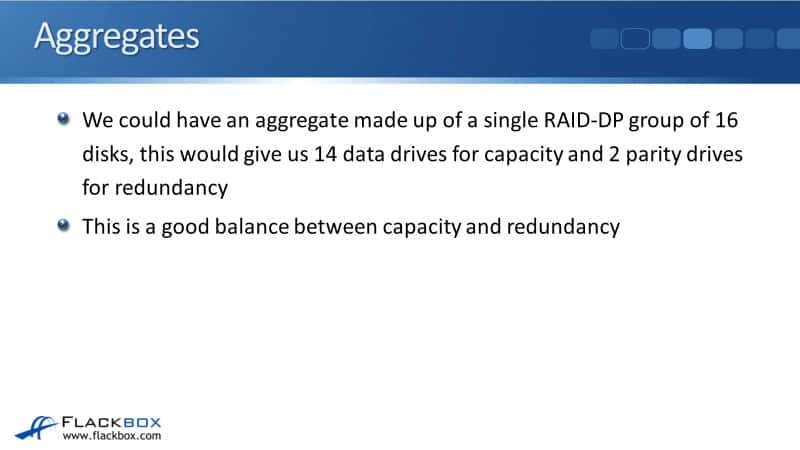 So, you could have an aggregate made up of a single RAID-DP group of 16 disks. With RAID-DP, you've got two parity drives. That would give you 16 data drives for capacity and two parity drives for redundancy and that example is a good balance between capacity and redundancy.