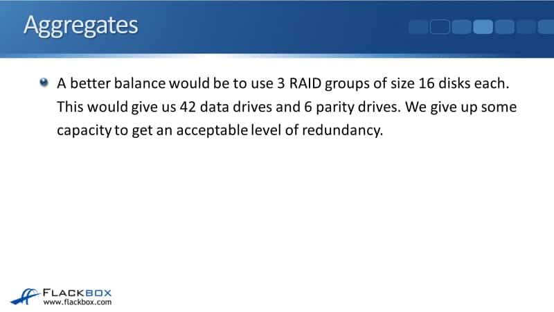For example, we had 48 drives, we don't want that to be made up of just one RAID group. Since that would give us 46 data drives and two parity drives, so there's not enough redundancy. It would be better to use three RAID groups having 16 disks each. That would give us 42 data drives and six parity drives which means that we're giving up some capacity.