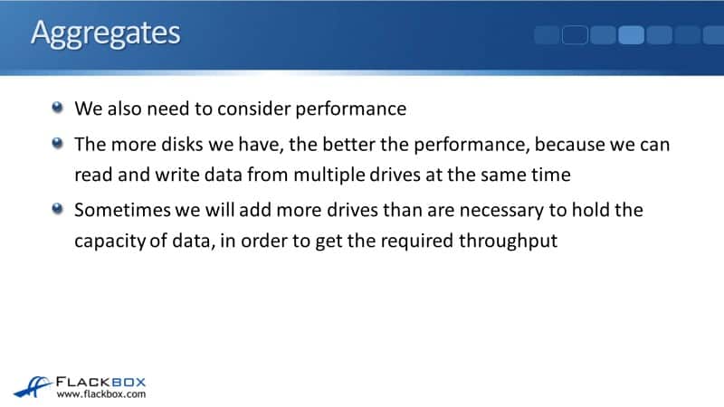 We also need to consider performance when we are creating our aggregates as well. The more disks that we have in an aggregate the better the performance because we can read and write from multiple drives at the same time. Sometimes it would be recommended to add more drives than the necessary to hold the capacity of data.