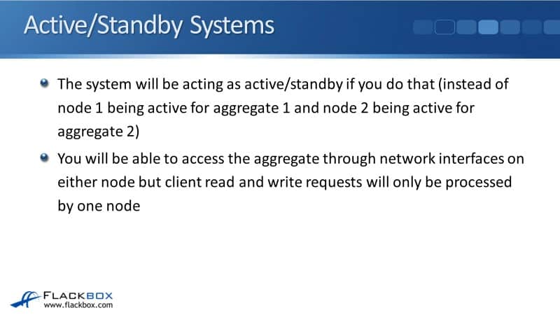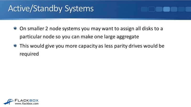 The next thing to talk about is active standby systems. On smaller entry-level two-node systems, something that's sometimes done is to assign all disks to a particular node so you can make one large aggregate.