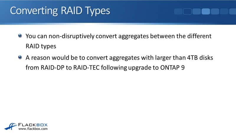 When converting RAID types, you can non-disruptively convert aggregates between the different RAID types. This is not commonly done though. Normally when you're setting things up in the first place, you're going to need to know what RAID type you're going to want to use. You're going to set that, and it's not going to change.