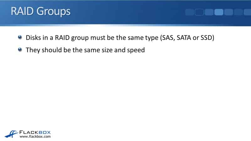 This is the same with speed as well. If you've got one drive in the RAID group operating at a lower speed, they're all going to run at that lower speed. So in your RAID group, you want your disks to be the same type, the same size, and the same speed. You also want to have spare drives available in the system as well.