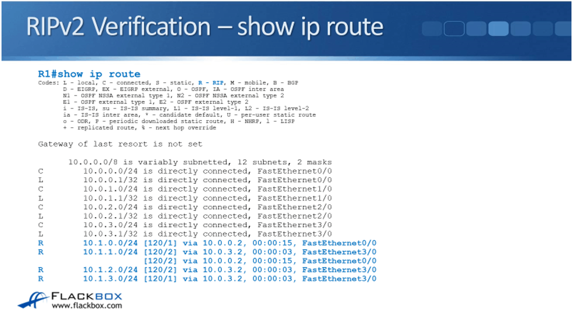 In the example here, I can see that I've got 4 routes that were learned via RIP. I can see that by on the column on the left, it says R; means they were learned by RIP.