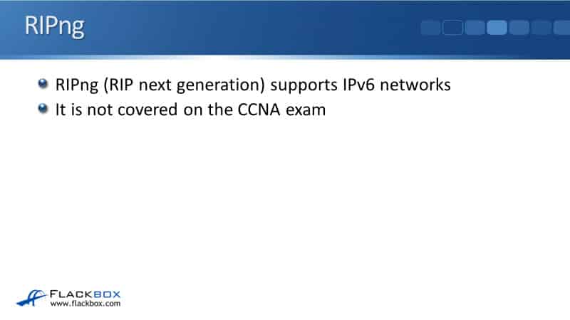 We also have RIPng which is RIP next generation. It supports IPv6 networks. It's not covered on the CCNA exam, you only need to know RIPv2.