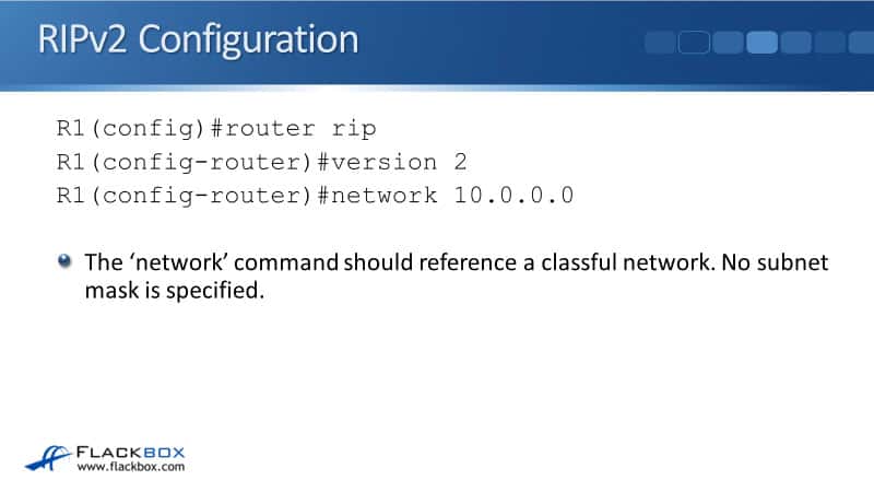 Then optionally, we're going to say version 2. We do want it to be running the latest version. To specify the interfaces that you want RIP to be running on and to be advertised, we use the network command. In this example, we've said network 10.0.0.0. All interfaces that begin with 10 will start sending out RIP hello messages and try to form an adjacency.