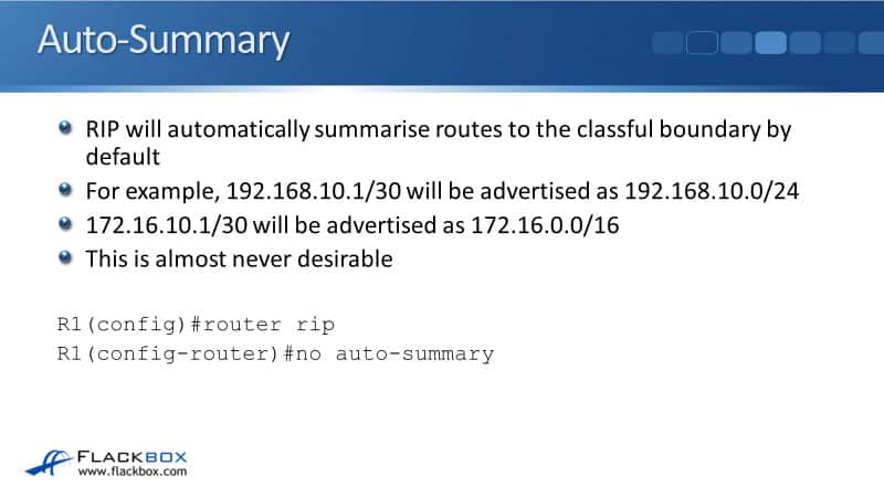 So, if you leave auto summary turned on, it's liable to cause havoc on your network, dropping some of your traffic. Therefore, we always disable auto summary. To do that, the commands are: