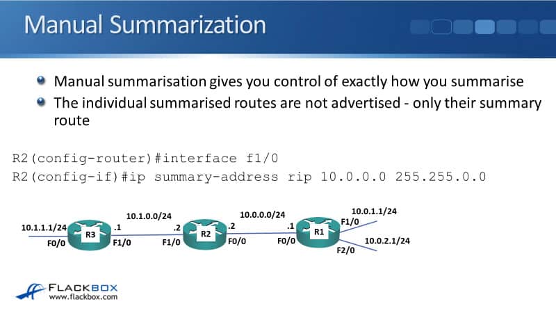 Now, we get control of exactly how we are summarizing. When we do this, the individual summarized routes that fall within the larger range are not going to be advertised, only the summary route. In the neighbor router that learns the route, it's not going to learn all those different individual routes. It will only learn the summary route.