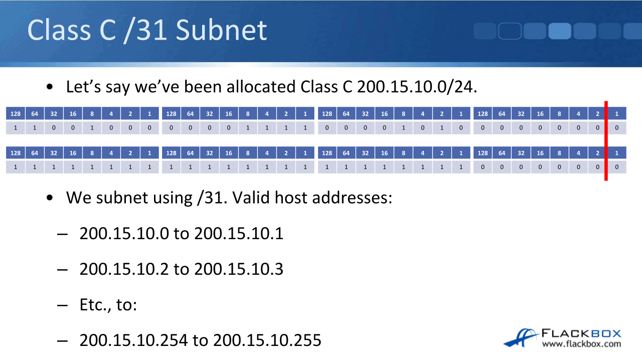 Class C /31 borrows 7 bits for the network address from the host address. That gives us 128 subnets, which is 2 to the power of 7. /31 can accommodate two hosts each.