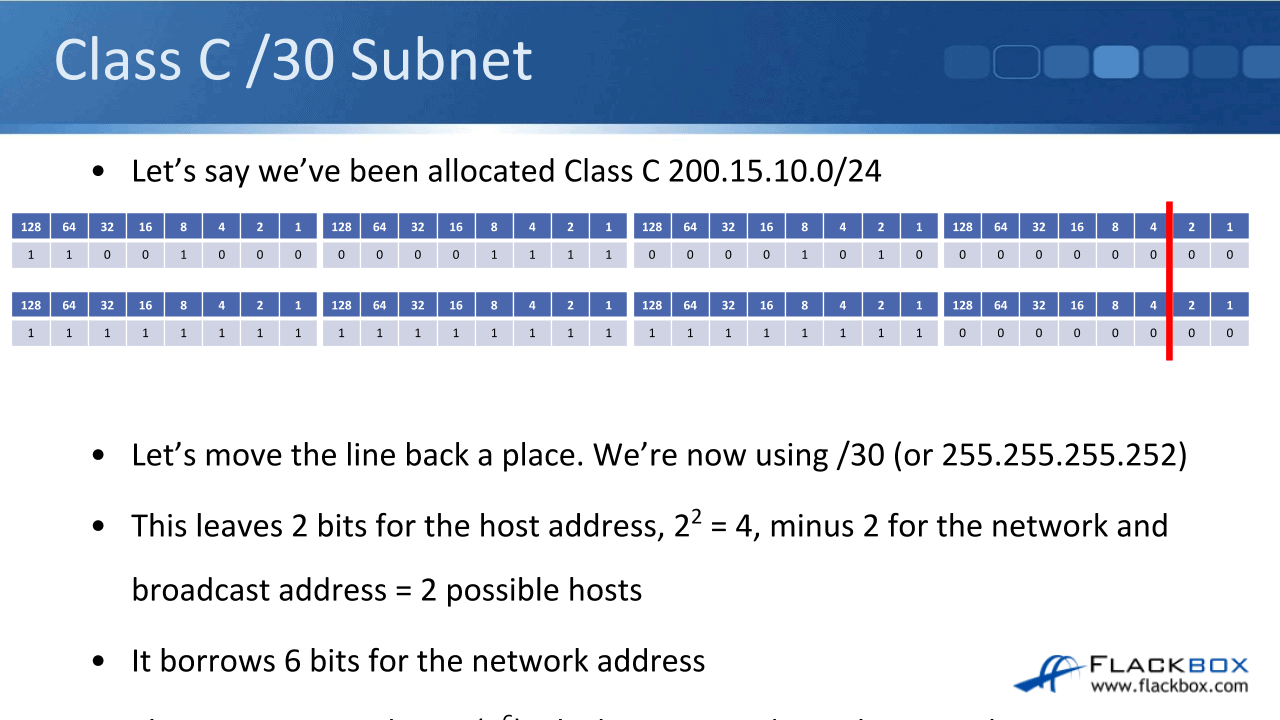 Next up, we're going to create a /30. The subnet mask in dotted decimal is 255.255.255.252 and it will be going to leave 2 bits for the host address.
