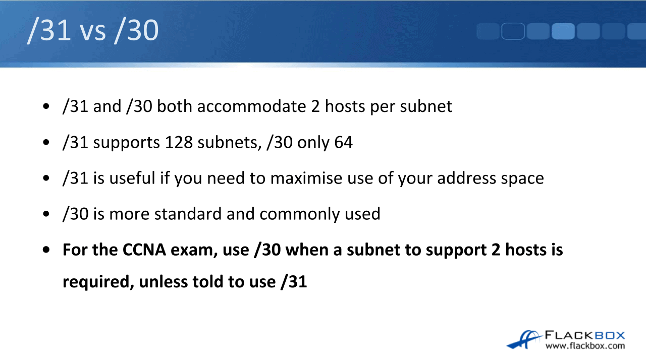 /31 and /30 both supported two hosts per subnet. But a /31 supports 128 subnetworks and a /30 only supports 64 subnets. You're maybe thinking, "Oh well we're always going to use /31 then." A /31 is useful if you need to maximize the use of your address space, but a /30 is more commonly used. It's more standardized.