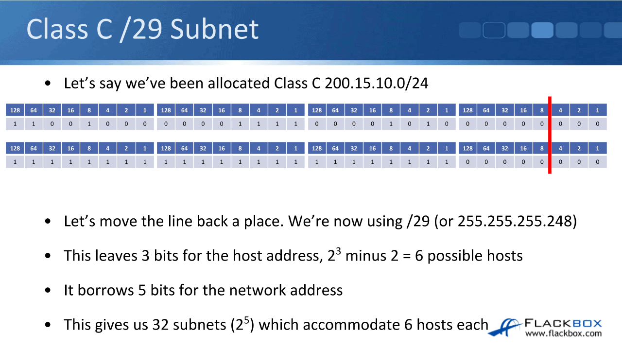 Here, we're using a /29 so we're borrowing 5 bits for the network address. 2 to the power of 5 is 32 so, we've got 32 available subnets here.