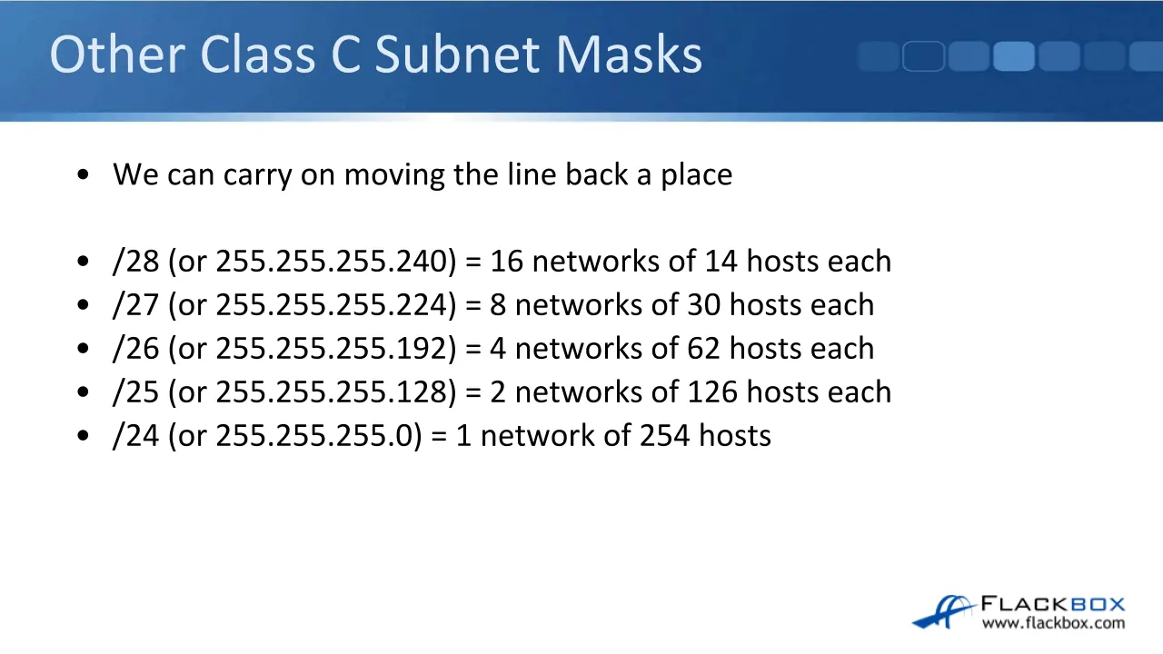 We can carry on moving the line back a place. We did /31, /30, /29. We could also do a /28, which is 255.255.255.240. It will give us 16 networks of 14 hosts each on a Class C. Again, the default is a /24.