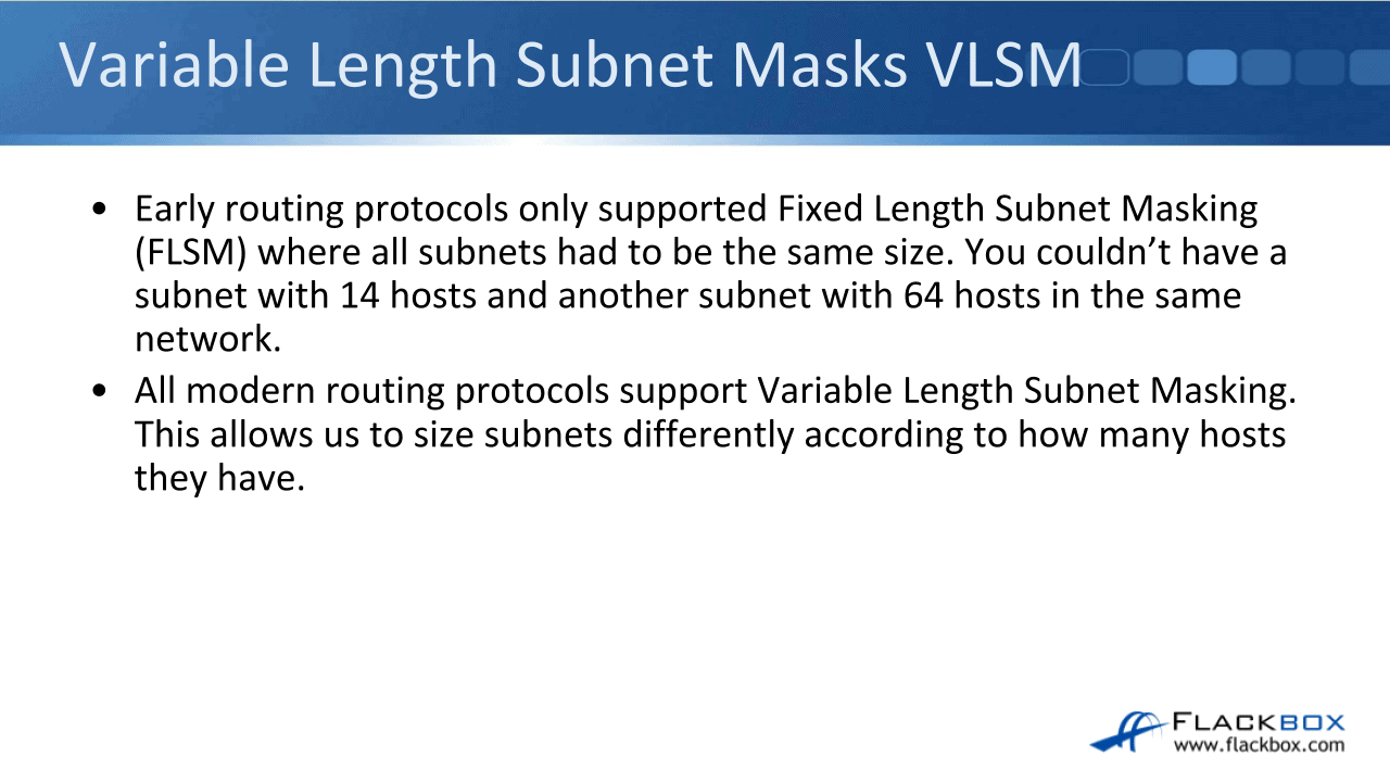 The next thing to tell you about is Variable Length Subnet Masks. With early routing protocols, like RIP version 1, they only supported fixed-length subnet masks. It means that you could perform subnetting but all subnets in a particular network had to be the same size.