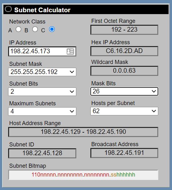 The network address of this IP subnet is 198.22.45.128 as we just calculated.