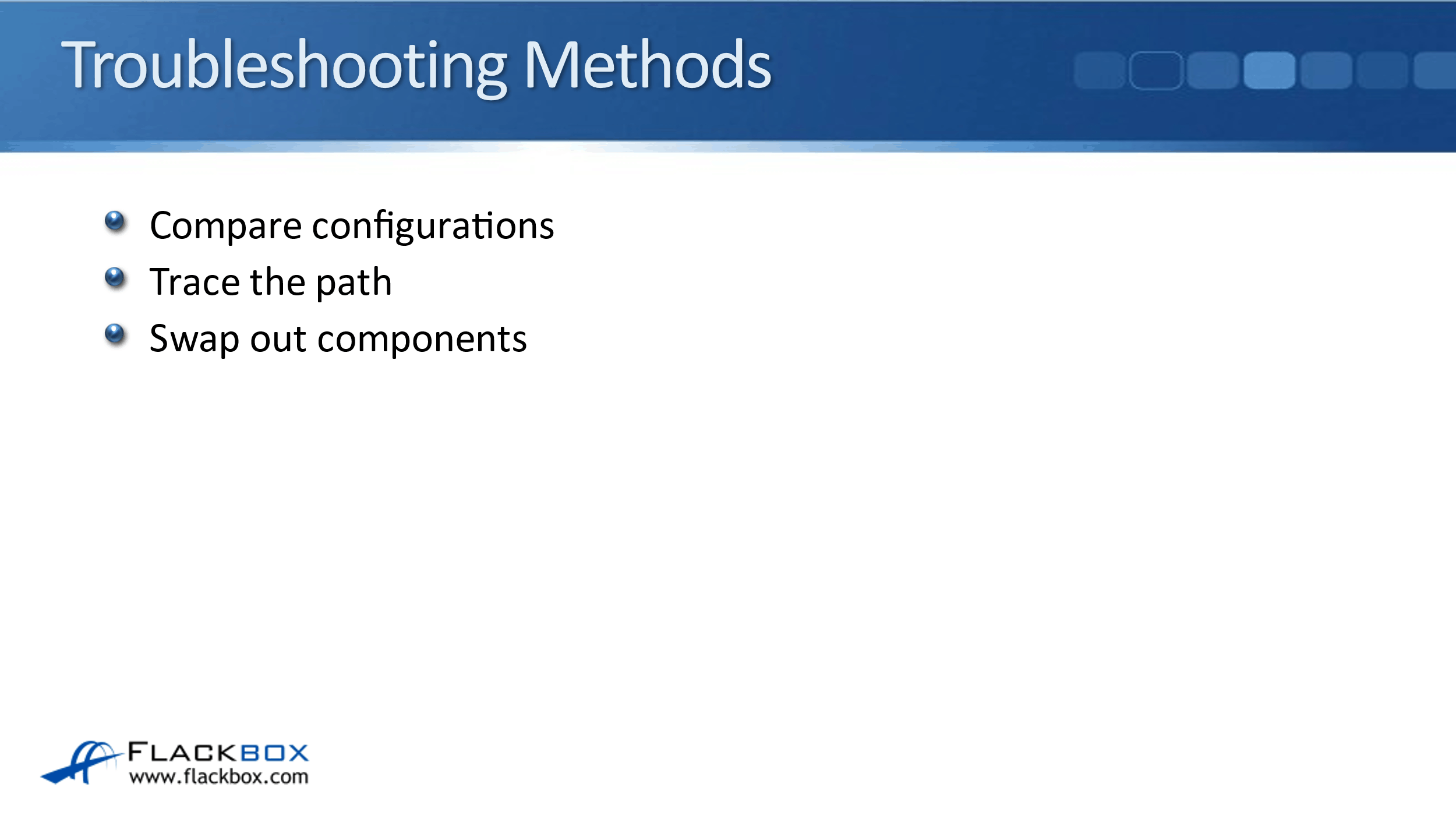 The last one mentioned here is swap out components. If you think that you have narrowed the problem down to a particular device, but you can't see a configuration error on there, a way you can confirm it is by swapping out with some known good hardware. The problem might be down to the physical level or maybe it's just something you're missing.