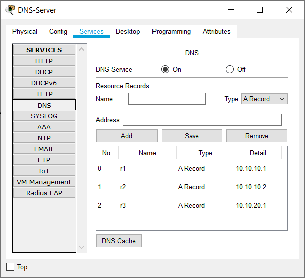 Note that routers cannot be DNS servers in Packet Tracer (it does not support the ‘ip dns server’ command) so we are using a Packet Tracer server device as the DNS server.