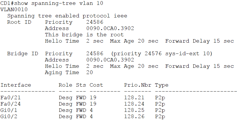 3. Verify CD1 has the best Bridge Priority and becomes the Root Bridge.