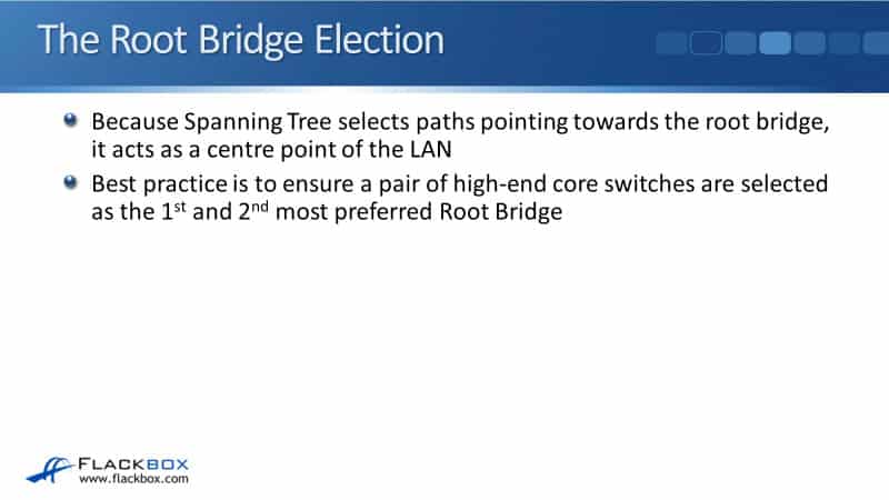 Since Spanning Tree selects paths pointing towards and away from the Root Bridge for forwarding traffic along, the Root Bridge acts as a center point of the LAN. Best practice is to ensure that a pair of high-end core switches are selected as the first and second most preferred Root Bridge.
