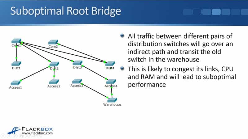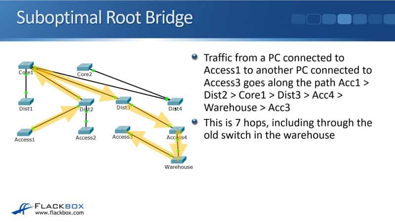 It's pinging around all over the network and going via the warehouse switch, and it's seven hops in total. That's the suboptimal Root Bridge selection. All traffic between different pairs of distribution switches will go over an indirect path and transit that old switch in the warehouse.