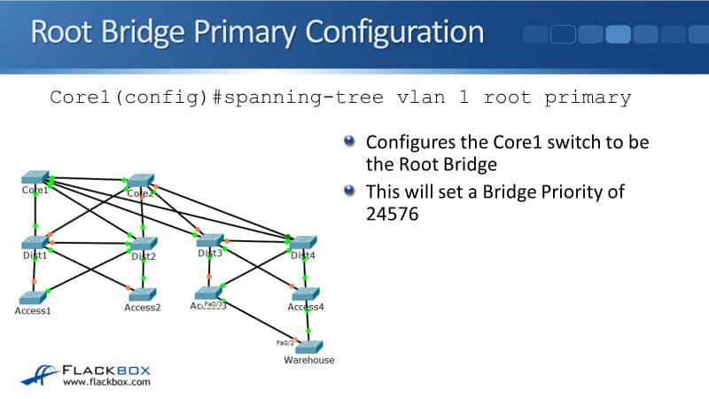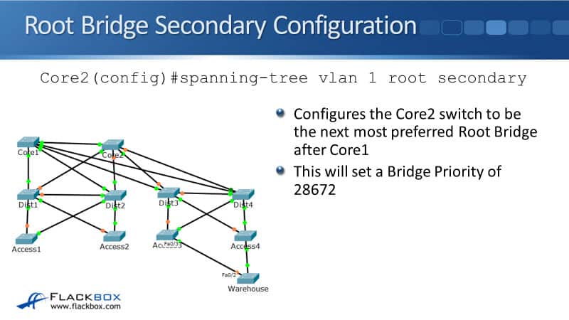To do that, we need to configure Core2 to be the next most preferred Root Bridge. If we didn't do that and Core1 went down, when we had that outage we would be back to the warehouse being the Root Bridge again and we want to avoid that. We always want traffic to be going through the core.