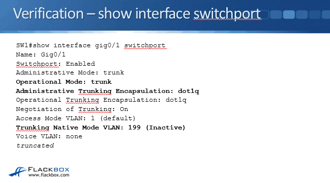To verify the configuration we use the command show interface gig0/1 switchport. We can see the operational mode is trunk, the encapsulation being used is Dot1Q, and the native VLAN is 199. We see ‘inactive’ because we don't have any access ports configured in VLAN 199.