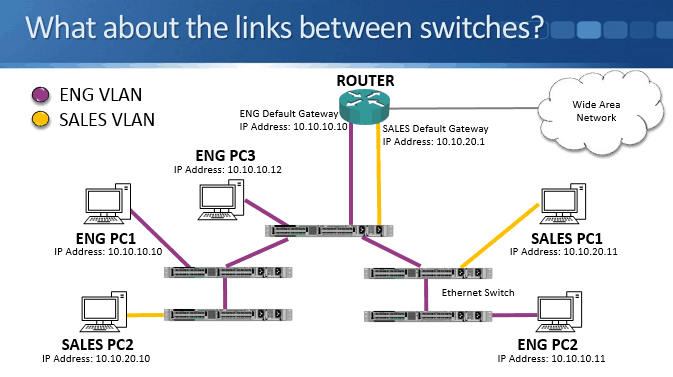 We need to configure the links between switches correctly. If we configure them for the Engineering VLAN, then all the Engineering PCs will be able to communicate with each other, including when they’re connected to different switches. But Sales PCs would only be able to communicate with each other if they’re connected to the same switch.