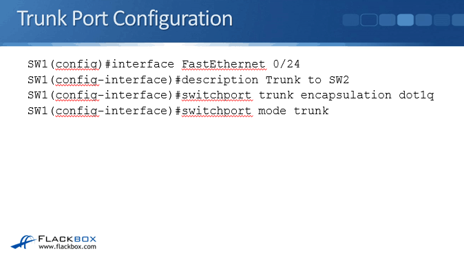 The above example shows manual trunk port configuration. Switch ports can also form a trunk automatically using DTP (Dynamic Trunking Protocol) which will be covered in the next post in this series. Manual configuration as shown here is the recommended method.