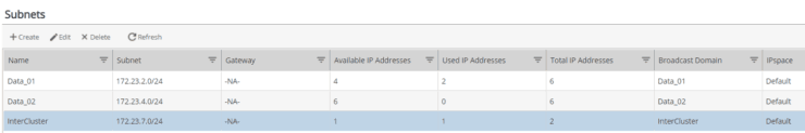 - InterCluster Network – for Snapmirror replication: 172.23.7.0/24