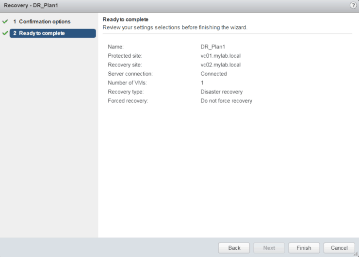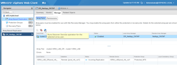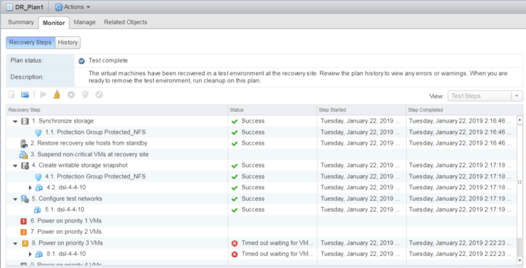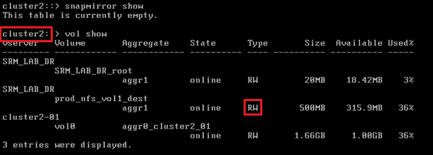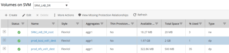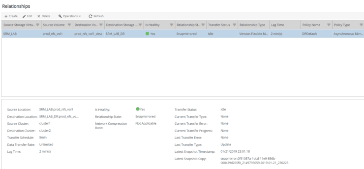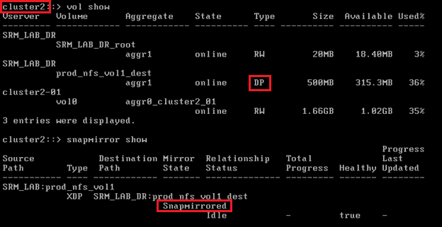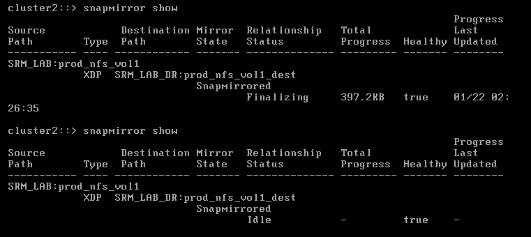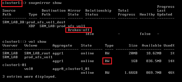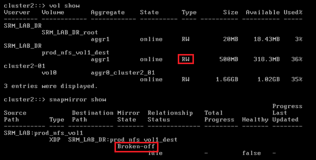 - During Run Recovery Plan, we will suspend the snapmirror replication and make DR volume read/writable. Present DR volume directly to ESX server. SRM will power on VMs from DR volume Datastores and put VMs to respective networks based on network mappings.
