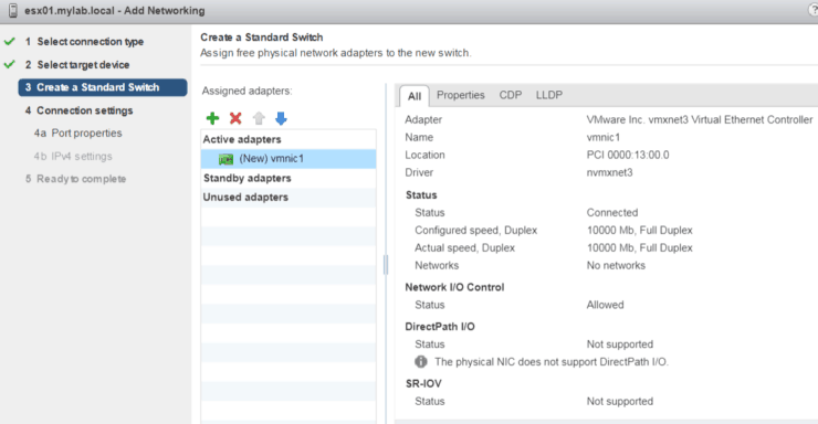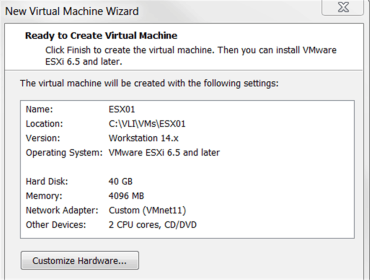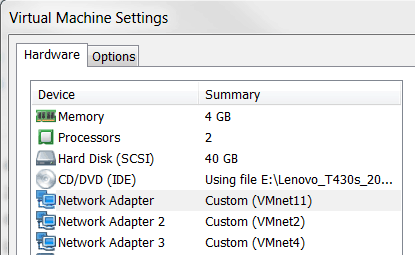 For example, ESX01 needs network 192.168.70.0 (for Management), 172.23.2.0 (for NFS and iSCSI access – path #1), 172.23.4.0 (for iSCSI access – path #2). Thus, we need add three network adapters with connections to VMnet11, VMnet2 and VMnet4 per below screenshot.