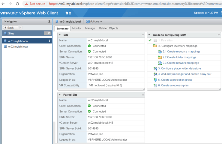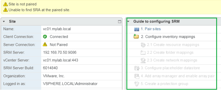 As a first step, we need pair Prod Site and Dr Site. Go to SRM Sites you will see a “Guide to configuring SRM” wizard. It is very easy to follow.