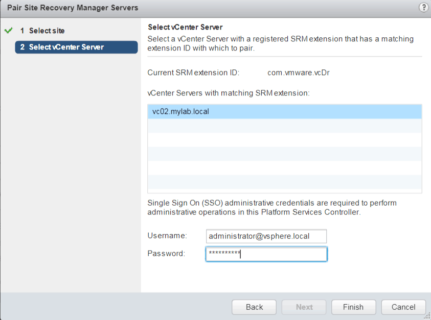 2. Provide remote site SSO administrative credentials. Click on Finish.