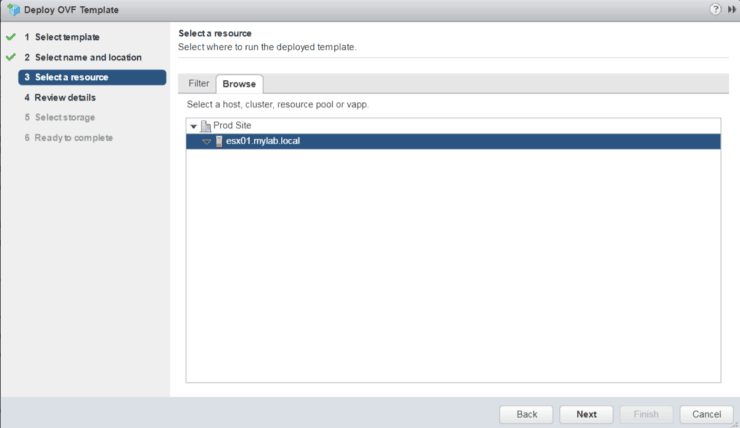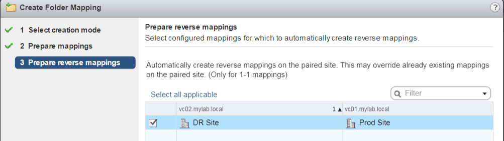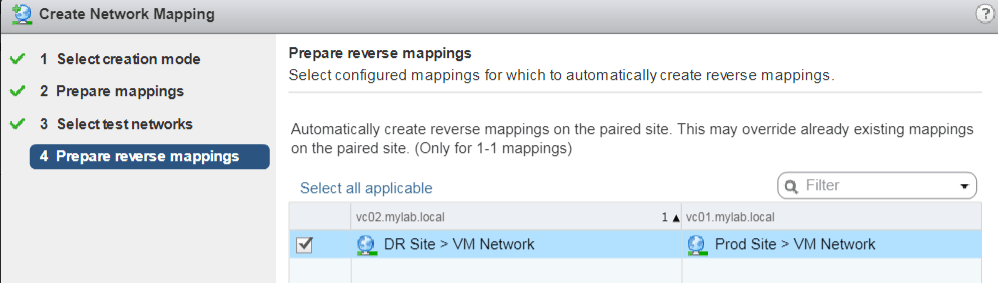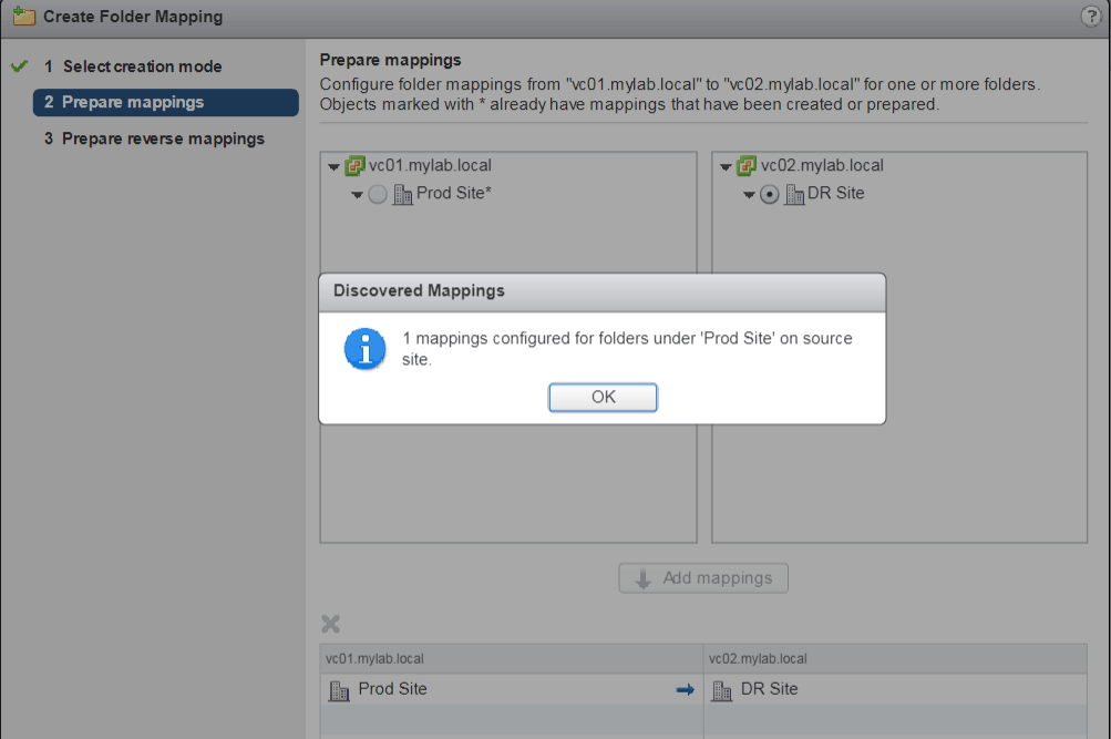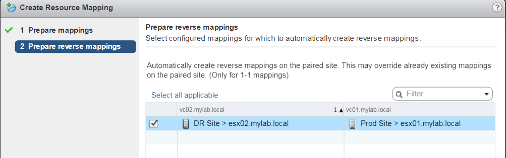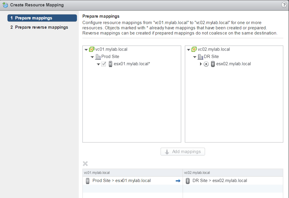 Basically, in our lab, we only have one ESX at each site, there is not much options here. ESX01 at Prod Site will map to ESX02 at DR site – that means VMs will move from ESX01 to ESX02 during Disaster Recovery or Migration by SRM.