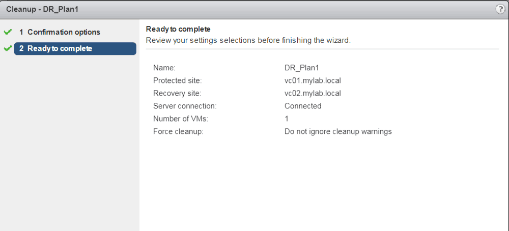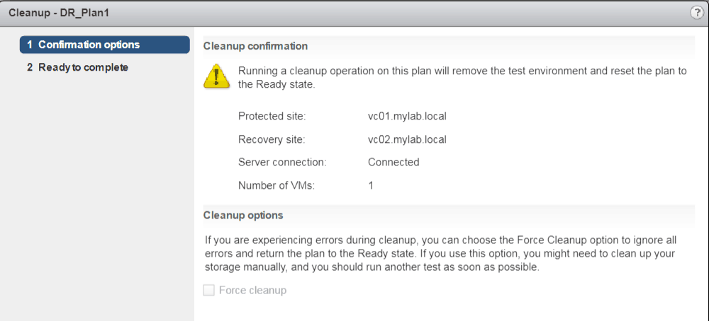 Basically, cleanup will Power off VMs, delete the snapshot volume (testfailover_xxxxx) was used for testing and testing the temporary created isolated network.