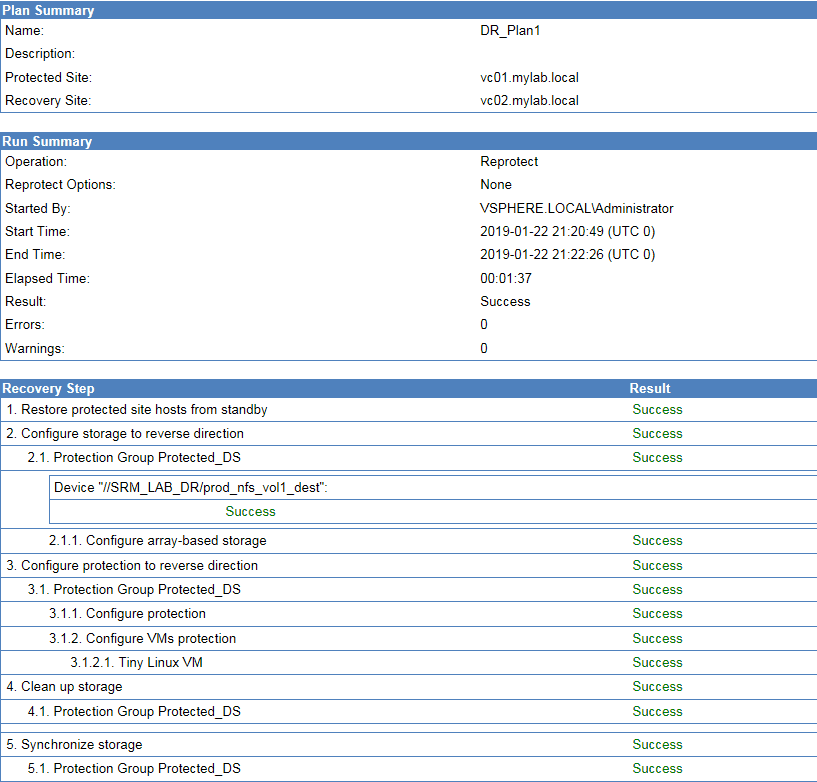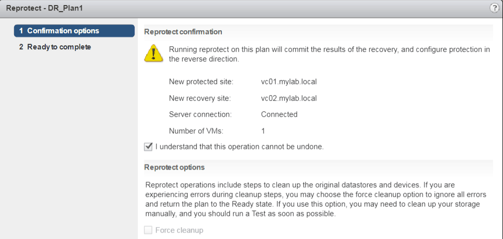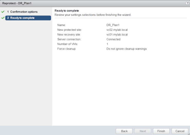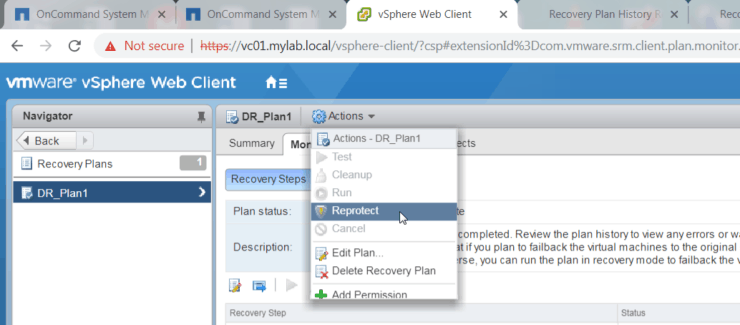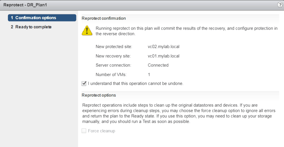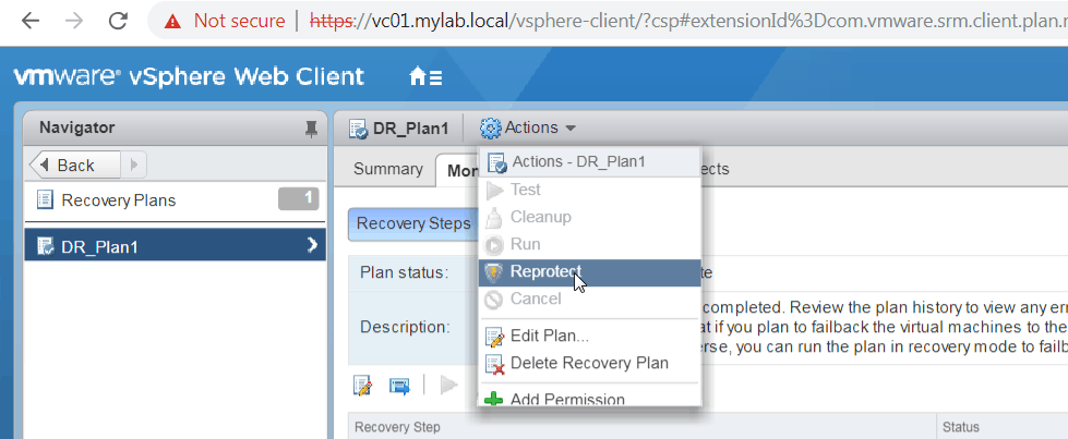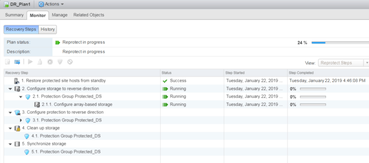 Finally, let run reprotect to recover everything back to normal replication direction: Prod Site DR Site