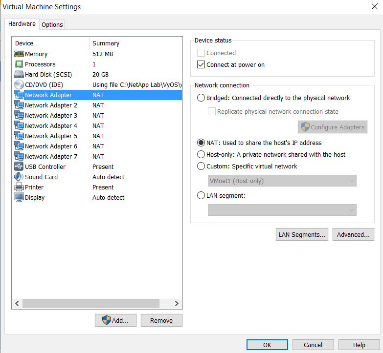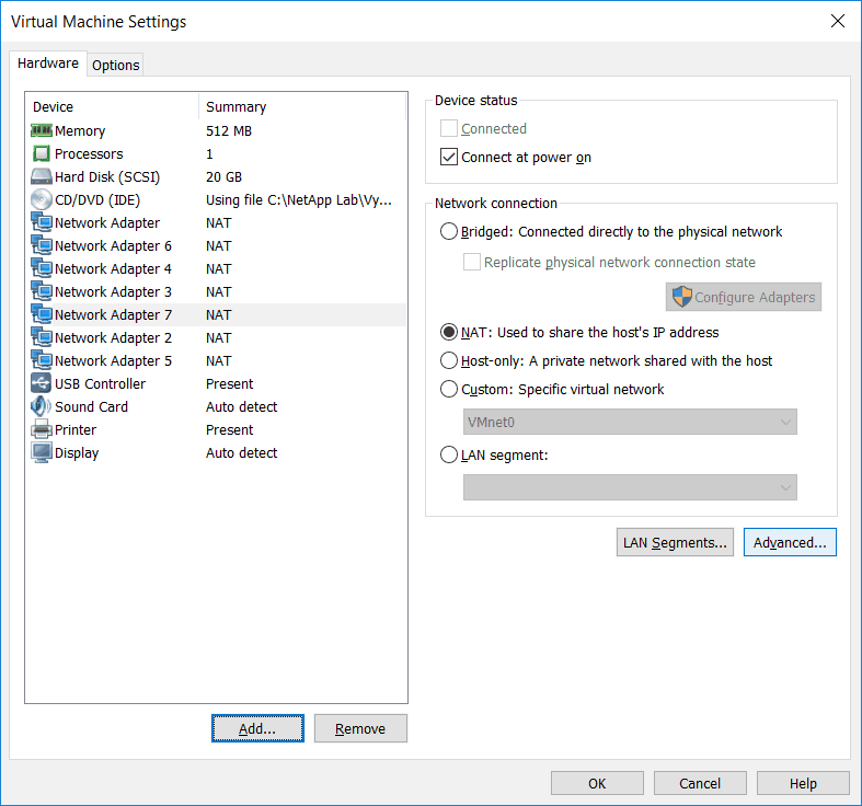 - This will add Network Adapter 2. Repeat 5 more times to add Network Adapters 3 to 7. Your virtual machine settings should look similar to below. The network adapters may be listed in a non-sequential order. Click OK.